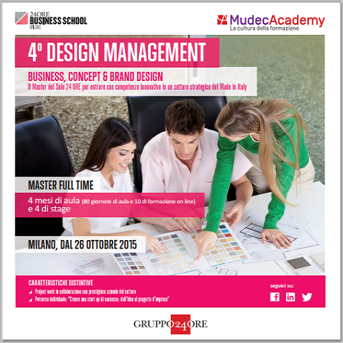 Dalla partnership con le principali aziende, nazionali e multinazionali, ed i più grandi studi di architettura e design, è nato il Master in Design Management, organizzato dalla Business School del Sole 24 ORE, la cui quarta edizione partirà a Milano il prossimo 26 ottobre 2015.