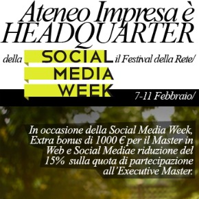 Proprio in occasione della Social Media Week, e per tutto il mese di febbraio, Ateneo Impresa riserva un extra bonus di 1000 euro a tutti i candidati al Master in Web e Social Media , ed una riduzione del 15% sulla quota di partecipazione sull’ Executive Master in Comunicazione Digitale e Social Media .