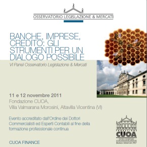 “Banche, imprese, credito: gli strumenti per un dialogo possibile”: un tema quanto mai attuale, un punto di partenza necessario per far ripartire l’economia italiana. È il titolo del VI Panel dell’Osservatorio Legislazione & Mercati, costituito all’interno di CUOA Finance, che sarà presentato venerdì 11 e sabato 12 novembre presso Villa Valmarana Morosini ad Altavilla Vicentina (Vicenza), sede della Fondazione CUOA.