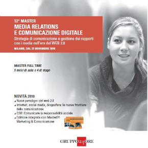 Il Master MEDIA RELATIONS E COMUNICAZIONE DIGITALE della Business School del Sole 24 ORE si rivolge a giovani laureati che vogliano indirizzare il proprio futuro professionale verso il settore della comunicazione e più specificatamente verso la gestione dei rapporti con i media. Obiettivo del master è quello di fornire ai partecipanti gli strumenti e le tecniche più innovative per migliorare i processi di comunicazione aziendale, con particolare attenzione alle attività e agli strumenti dell’ufficio stampa.