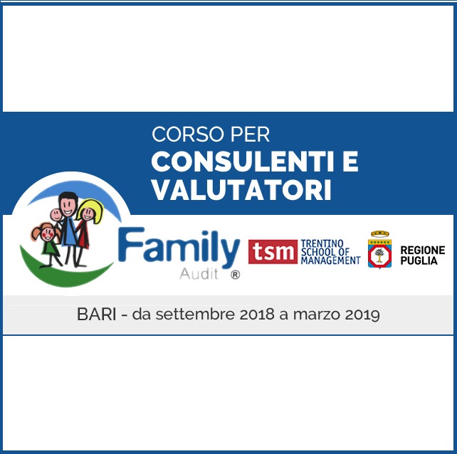 La Regione Puglia propone un percorso formativo per la preparazione di consulenti e valutatori Family Audit locali e un sostegno alla promozione della certificazione nelle imprese pugliesi. Al termine del percorso e previo superamento dell’esame finale saranno conferiti, a seguito delle procedure amministrative previste, l’attestato di consulente e l’attestato di valutatore in materia di Family Audit che permetteranno l’iscrizione al Registro dei consulenti e dei valutatori dello standard Family Audit di cui alla legge provinciale 1/2011 “Sistema integrato delle politiche strutturali per la promozione del benessere e della natalità”.