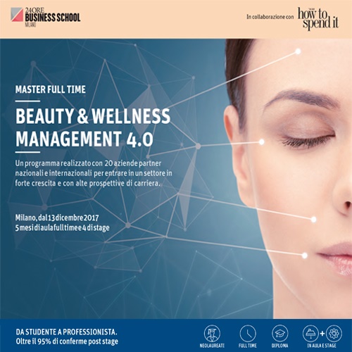 Avrà inizio a Milano il 13 dicembre 2017 la 1^ edizione del Master Beauty & Wellness Management 4.0, un percorso full time organizzato dalla Business School del Sole 24 ORE e in collaborazione con How to Spend It, pensato per giovani laureati e laureandi in discipline umanistiche, giuridiche, socio-economiche e linguistiche fortemente interessati ad inserirsi in società che operano nel mondo del beauty, wellness e lifestyle.