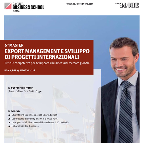 Il Master Export Management e Sviluppo di Progetti Internazionali della Business School del Sole 24 ORE ha l'obiettivo di fornire ai partecipanti gli strumenti e le competenze necessarie per progettare e gestire i vari processi di internazionalizzazione di imprese di grandi e medie dimensioni.