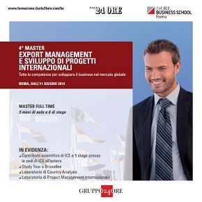 Il Master Export Management e Sviluppo di Progetti Internazionali del Sole 24 ORE ha l'obiettivo di fornire ai partecipanti gli strumenti e le competenze necessarie per progettare e gestire i vari processi di internazionalizzazione di imprese di grandi e medie dimensioni.