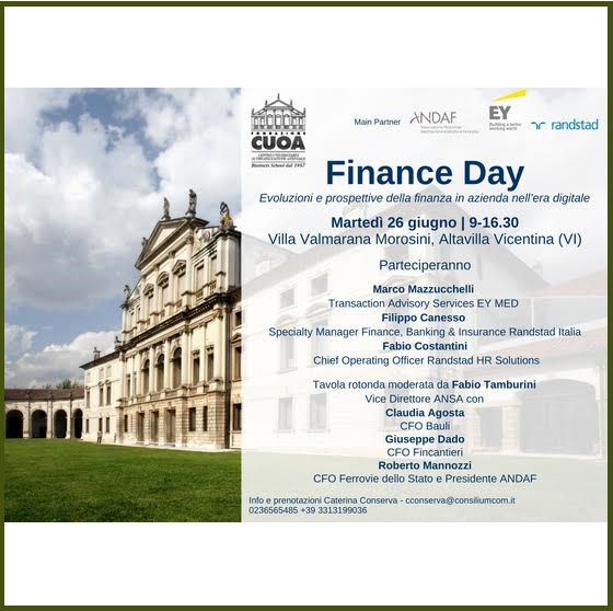 Nell’era dell’Industria 4.0 i molteplici cambiamenti in atto sulle aree di Amministrazione, Finanza e Controllo d’azienda incidono sulle dinamiche strategiche, tecniche e organizzative che i CFO e i Controller sono chiamati a sviluppare in primis. Su questo percorso si innestano le riflessioni al centro del Finance Day 2018, in programma il 26 giugno al CUOA. L’evento è rivolto a manager ed esperti del settore finanziario e quest’anno concentra il dibattito sull’impatto del digitale nell’area finanza delle imprese, con la partecipazione di qualificati esponenti del mondo aziendale e della consulenza.