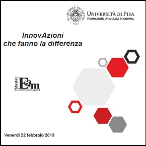 Venerdì 22 febbraio p.v. alle ore 9:30 presso l'Aula Magna del Dipartimento di Economia e Management si svolgerà il workshop "Innovazioni che fanno la differenza" che inaugura la decima edizione del Master in Economia Aziendale e Management attivato presso il Dipartimento di Economia e Management dell'Università di Pisa.