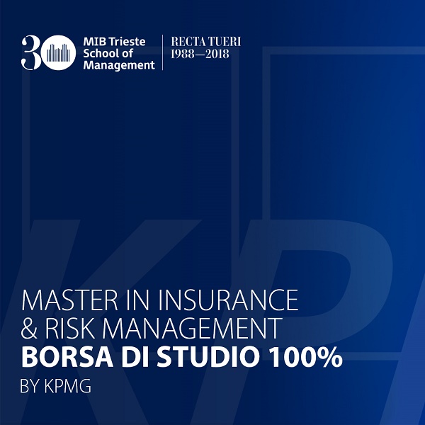 KPMG, main sponsor del Master in Insurance & Risk Management (MIRM) del MIB Trieste School of Management, conferma anche per la prossima 20ma edizione del Master una BORSA DI STUDIO a copertura del 100% del costo d’iscrizione (€ 22.000).
