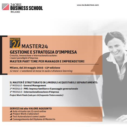 Milano, dal 20 maggio 2016: la Business School del Sole 24 ORE organizza la tredicesima edizione del master di specializzazione con diploma in Gestione e Strategia D’Impresa.