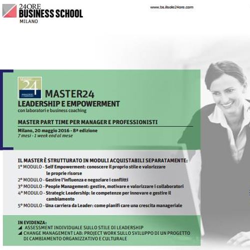 Milano, dal 20 maggio 2016: la Business School del Sole 24ORE organizza l’ottava edizione del master di specializzazione con diploma in Leadership & Empowerment. Un percorso formativo rivolto a tutti coloro che desiderano acquisire maggior consapevolezza sul proprio stile di leadership e sviluppare le competenze chiave di un manager negli attuale contesti organizzativi per contribuire all’accrescimento della competitività aziendale - engagement e motivazione dei team, sviluppo delle strategie ed execution - e migliorare la propria efficacia manageriale - self empowerment, leadership e negoziazione.