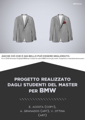 L’immagine che accompagna questo testo è stata realizzata nella quarta edizione del Master per BMW. Brief: campagna stampa/affissione sugli accessori originali BMW. Autori: E. Acosta (copy), A. Granados (art), V. Ottina (art).