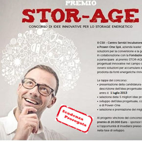 Un premio da 20.000 euro e un aiuto concreto per i giovani che vogliono fare impresa con l'energia green. Lo mette in palio la prima edizione del premio Stor-Age, promosso dall'incubatore di imprese Csii (Centro servizi incubatore di imprese), con sede a Cavriglia, in provincia di Arezzo, in collaborazione con la società Power One e la Fondazione Masaccio. Si tratta di un concorso di idee alla ricerca di una soluzione innovativa per conservare e accumulare l'energia prodotta da fonti energetiche rinnovabili.