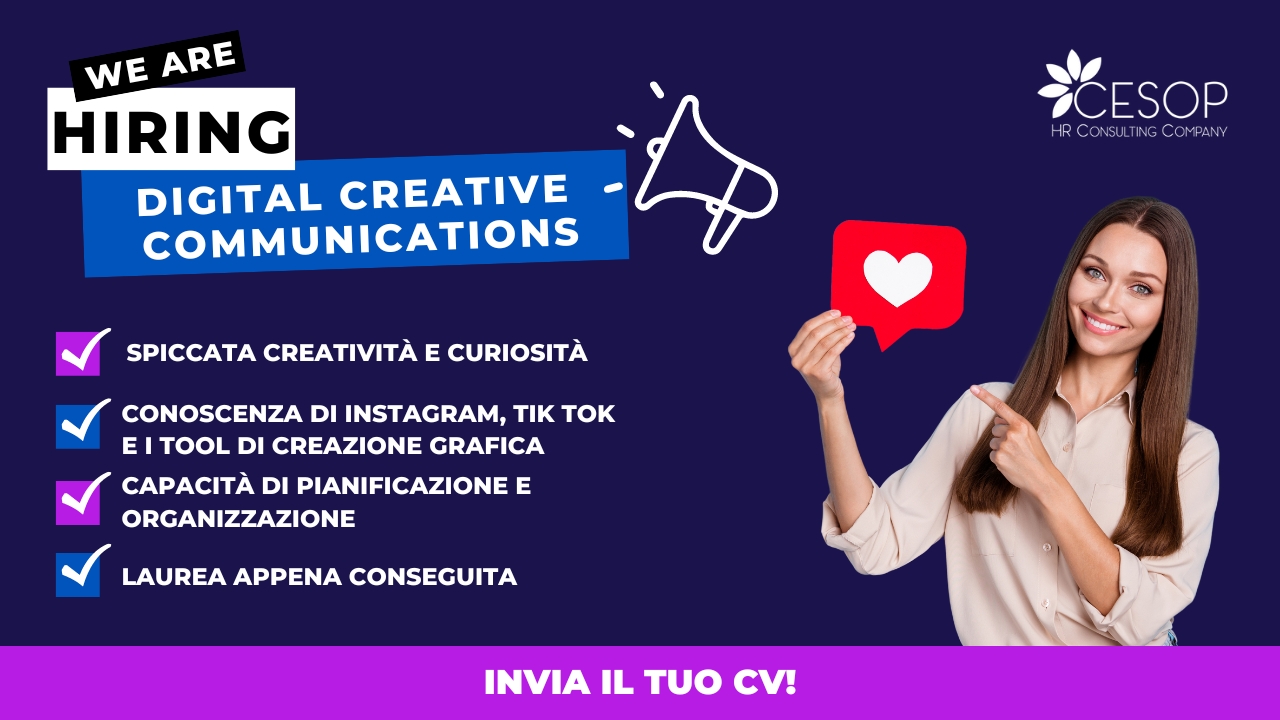 Se ti appassiona il mondo delle Comunicazione e delle Risorse Umane, la creatività e la curiosità sono parte del tuo DNA e hai conoscenza del mondo digital e social, questa è l'occasione che fa per te!