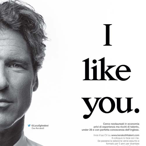 Il progetto ha una tale importanza per l’azienda che il Ceo, Gian Luca Sghedoni, ha deciso di mettere la sua “mezza faccia” nella campagna promozionale apparsa sui principali quotidiani (foto). «Ho deciso di usare la mia immagine – spiega l’ad – perché gli uomini e le donne che lavorano con noi sono la nostra risorsa più importante. E per questo, da sempre, li scelgo in prima persona. Kerakoll4talent è per noi il vivaio dei manager del futuro, e oggi siamo alla ricerca di quelli che spesso non vuole nessuno: giovani, neolaureati, senza esperienza ma con grande talento».