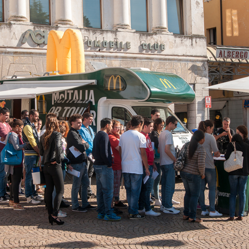 La procedura per candidarsi? Entro il 15 ottobre 2015, gli interessati possono partecipare alla prima fase di selezione rispondendo ad alcune domande (su disponibilità oraria, tipo di mansioni a cui si è interessati, area geografica di interesse) e inserendo il curriculum sulla pagina dedicata. Agli idonei verrà poi richiesta la compilazione di un test comportamentale. Soltanto chi supererà questi step sarà contattato da McDonald’s (ricevendo convocazione e indicazione dell’orario) e avrà accesso ai colloqui individuali che si svolgeranno in occasione della tappa dell’evento McItalia Job Tour (foto) che si svolgerà a Bolzano nella seconda metà di ottobre.