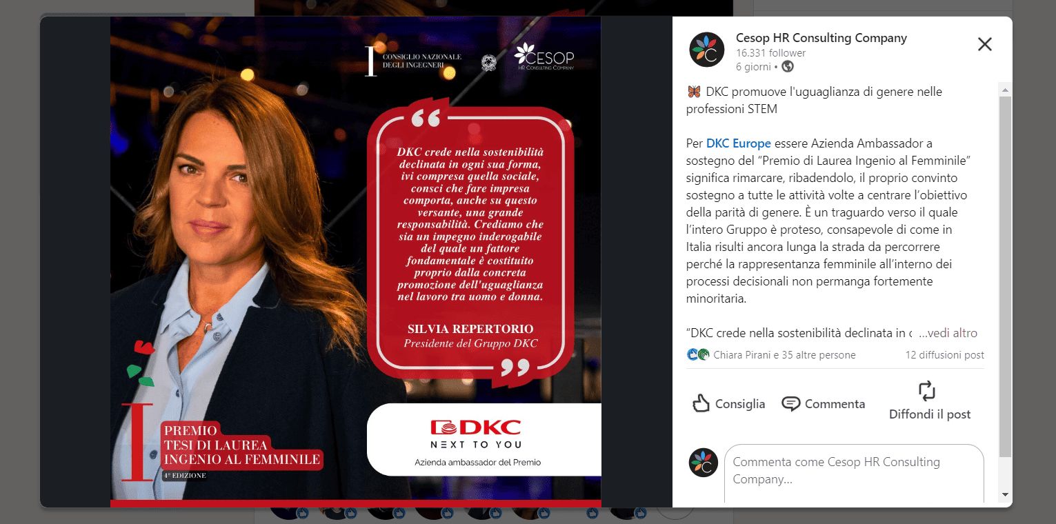 La valorizzazione della figura della laureata in ambito tecnico, intento alla base del Premio, è un’idea che trova in DKC un convinto sostegno. Tuttavia, e Repertorio lo sottolinea, occorre intervenire a monte: “È necessario promuovere forme di sensibilizzazione inerenti alle scelte educative delle donne, serve intervenire attivando processi di consapevolezza a partire dagli spazi scolastici”, dichiara la Presidente del Gruppo DKC alla luce della scarsa presenza femminile nelle facoltà universitarie focalizzate su discipline STEM, l’ambito poi più fiorente in termini occupazionali.