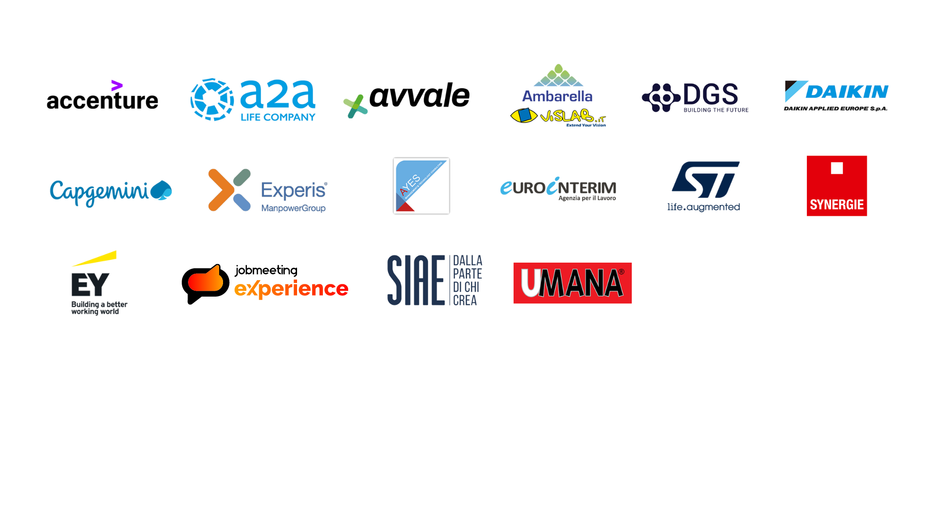 A2A, Accenture, Ambarella-VisLab, Avvale, AYES, Capgemini, Daikin Applied Europe, Knauf, Serco, Synergie, DGS, Eurointerim, Experis, EY, SIAE, STMicroelectronics, Umana