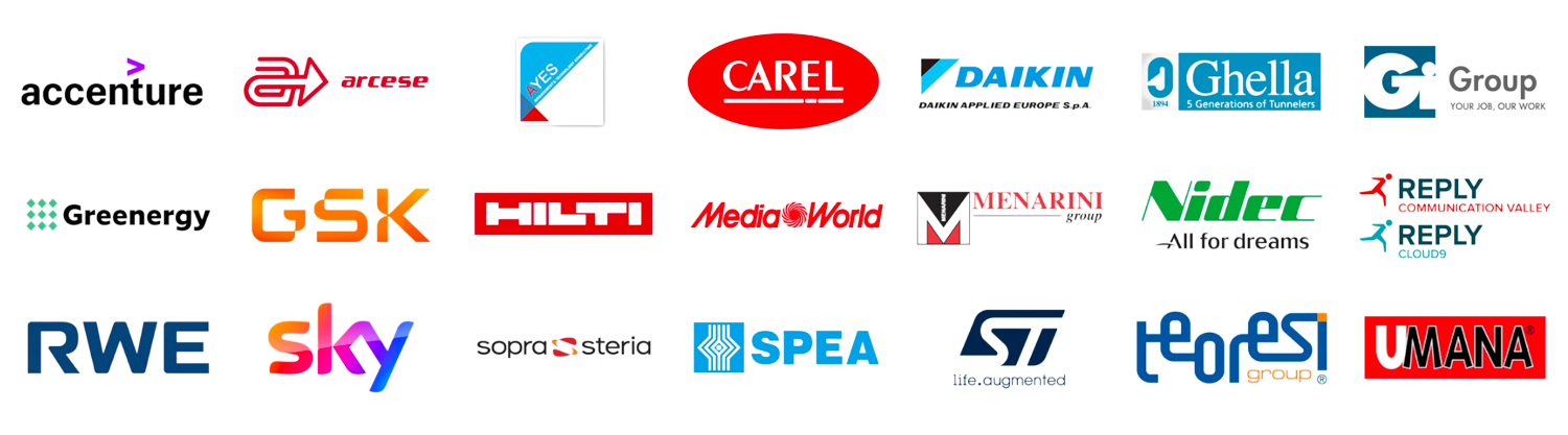 Accenture, AYES, CAREL, Communication Valley Reply - Cloud9 Reply, Ghella Spa, Gi Group, Greenergy, GSK, Hilti, Mediaworld, Menarini Group, Nidec ASI, RWE Renewables, Sky, Sopra Steria, SPEA, STMicroelectronics, Teoresi Group e Umana.