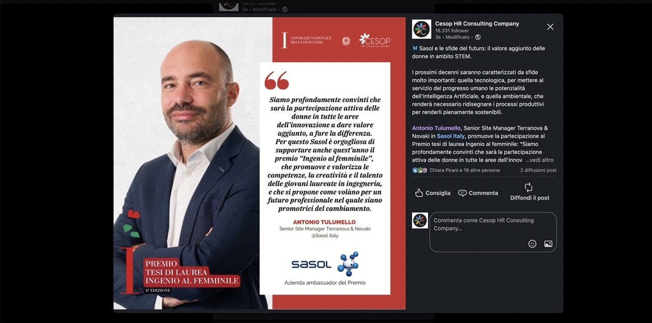 Antonio Tulumello, Senior Site Manager Terranova & Novaki in Sasol Italy, promuove la partecipazione al Premio tesi di laurea Ingenio al femminile: “Siamo profondamente convinti che sarà la partecipazione attiva delle donne in tutte le aree dell’innovazione a dare valore aggiunto, a fare la differenza. Per questo Sasol è orgogliosa di supportare anche quest’anno il premio “Ingenio al femminile”, che promuove e valorizza le competenze, la creatività e il talento delle giovani laureate in ingegneria, e che si propone come volàno per un futuro professionale nel quale siano promotrici del cambiamento.”