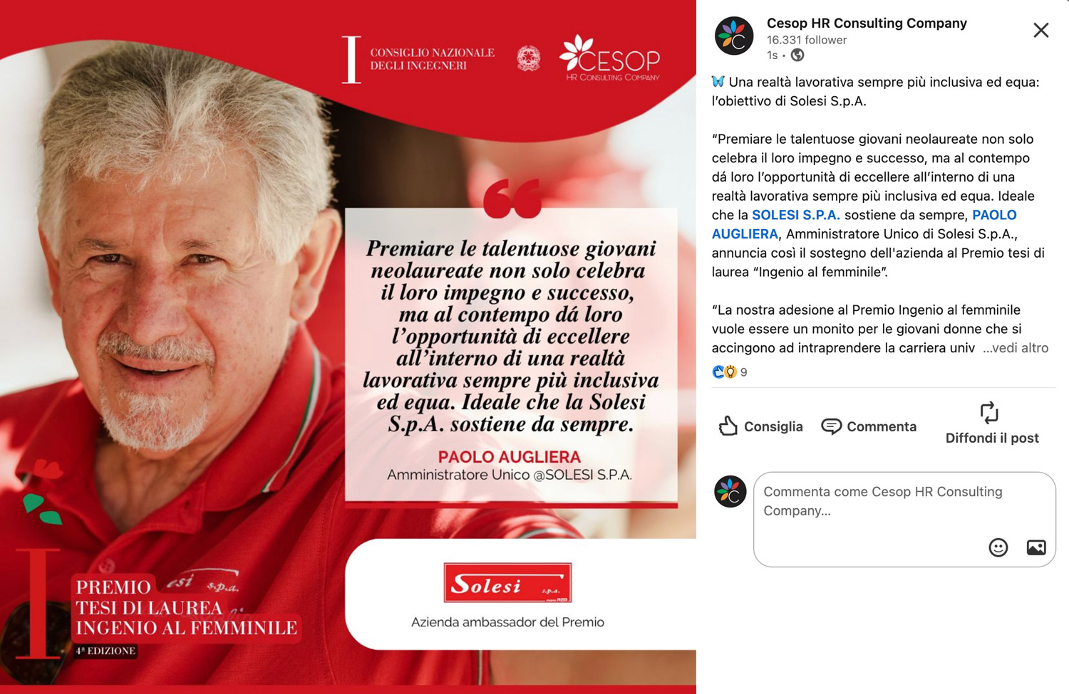 “Premiare le talentuose giovani neolaureate non solo celebra il loro impegno e successo, ma al contempo dá loro l’opportunità di eccellere all’interno di una realtà lavorativa sempre più inclusiva ed equa. Ideale che la SOLESI S.P.A. sostiene da sempre, PAOLO AUGLIERA, Amministratore Unico di Solesi S.p.A., annuncia così il sostegno dell'azienda al Premio tesi di laurea “Ingenio al femminile”.