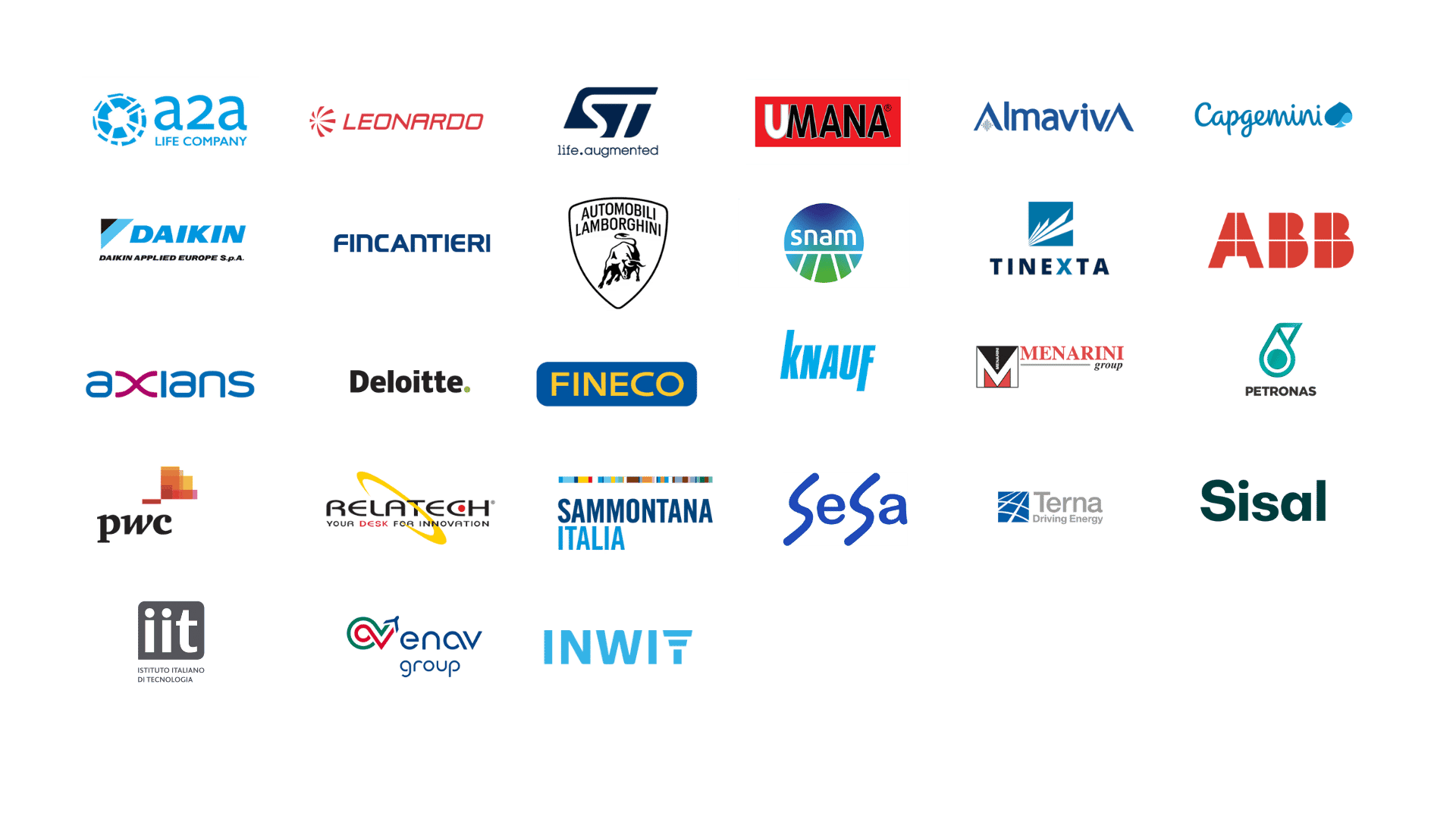 A2A, ABB, AlmavivA, Axians Italia, Capgemini, Daikin Applied Europe, Deloitte, ENAV Group, FINCANTIERI, Fineco, INWIT, Istituto Italiano di Tecnologia, Knauf, Lamborghini, Leonardo, Menarini Group, Petronas Lubricants International, PwC, Relatech S.p.A., SAFE, Sammontana, SeSa S.p.A., Sisal Italia, Snam, STMicroelectronics, Terna, Tinexta e Umana.